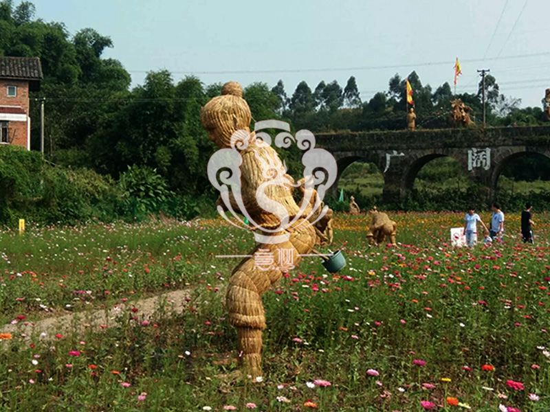 現在的精致稻草人藝術通常是由專業美術老師的造型放樣,然后由焊工師傅焊接出立體造型造型,然后以稻草或者稻草繩為材料編捆制作而成。