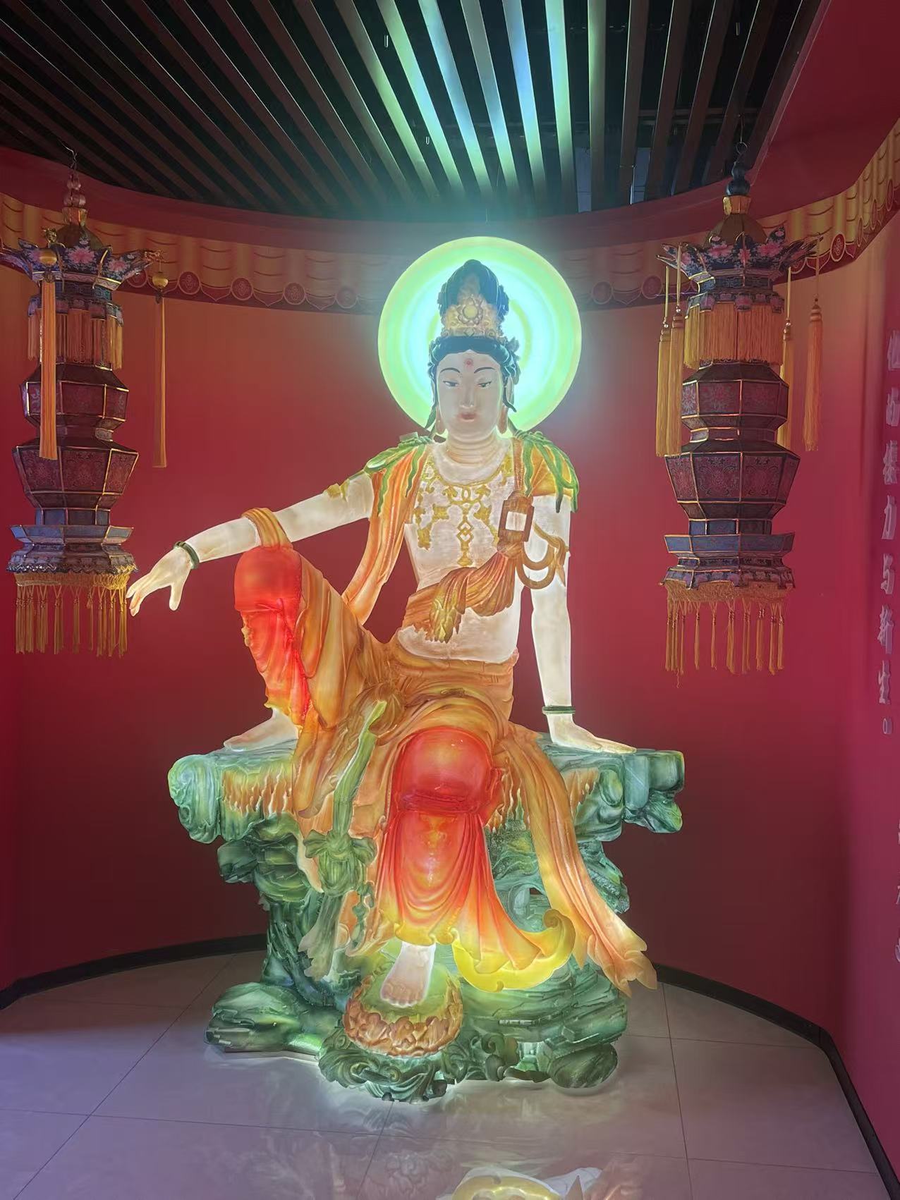 步入展廳,仿佛穿越至《山海經》記載的上古秘境。2米高的盤古開天燈組堪稱鎮館之作:工匠以圓鋼焊接骨架,外敷多層特制絲綢,通過分色裱糊技藝呈現 “天地初開” 的光影層次 —— 混沌處用磨砂絹布營造朦朧感,開天辟地的斧刃則以玻璃藥瓶拼接出鋒芒質感,內置的追光系統隨光影變化演繹 “陽清為天,陰濁為地” 的壯闊場景。不遠處的神農嘗百草燈組更顯精巧,神農衣袖以扎染工藝暈染出山川紋理,手中草藥采用絲瓜布與細竹篾編織,每片葉片都經過手工彩繪,燈光亮起時宛如仙草煥發生機。