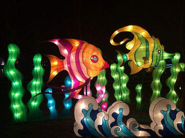花燈,又叫彩燈,是我國各地普遍流行的裝飾性的傳統(tǒng)工藝品?;羲囆g(shù)是燈的裝飾藝術(shù),是人們利用竹木、金屬、綾絹、綢緞、明珠、玉佩、絲穗、紙品、獸角、玻璃、羽毛、貝殼、麥稈、塑料等材料,根據(jù)形式美得法則或各地審美習慣、審美意識并綜合彩扎、裱糊、編結(jié)、刺繡、雕刻輔以剪紙,書畫等造型技藝設(shè)計制作的具有光亮的彩燈藝術(shù)。平日可用它烘托婚壽喜慶氣氛,到元宵燈節(jié),它便是人們觀賞、娛樂、競技、競藝的佳品。